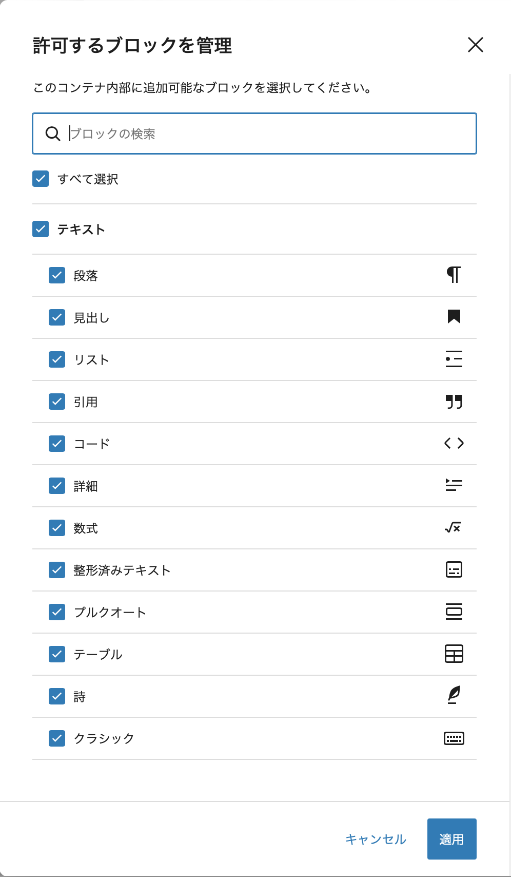 「許可するブロックを管理」ボタンを押すと、下記のようにブロックの一覧が表示されます。この中から選んだブロックだけを、コンテナ内部に追加できるようになるってことかと。